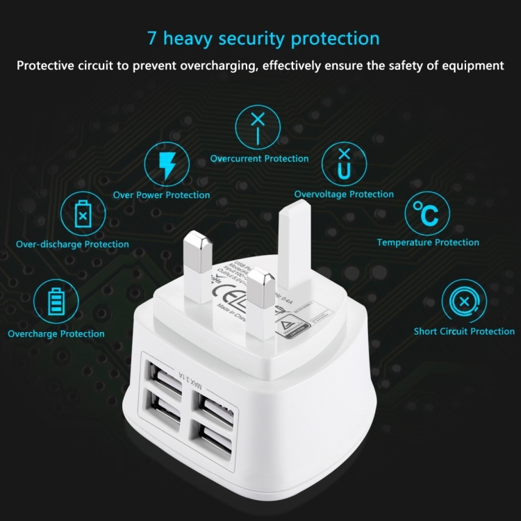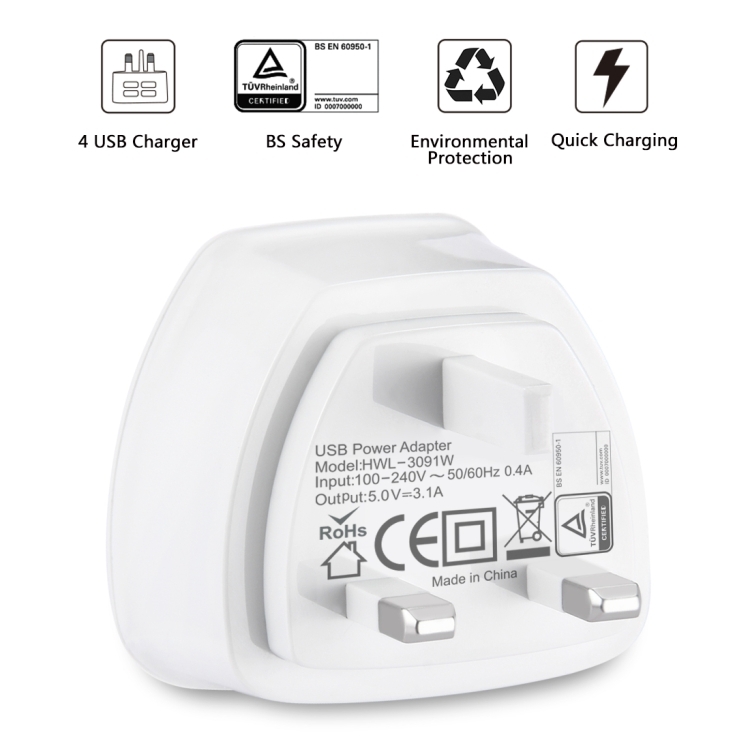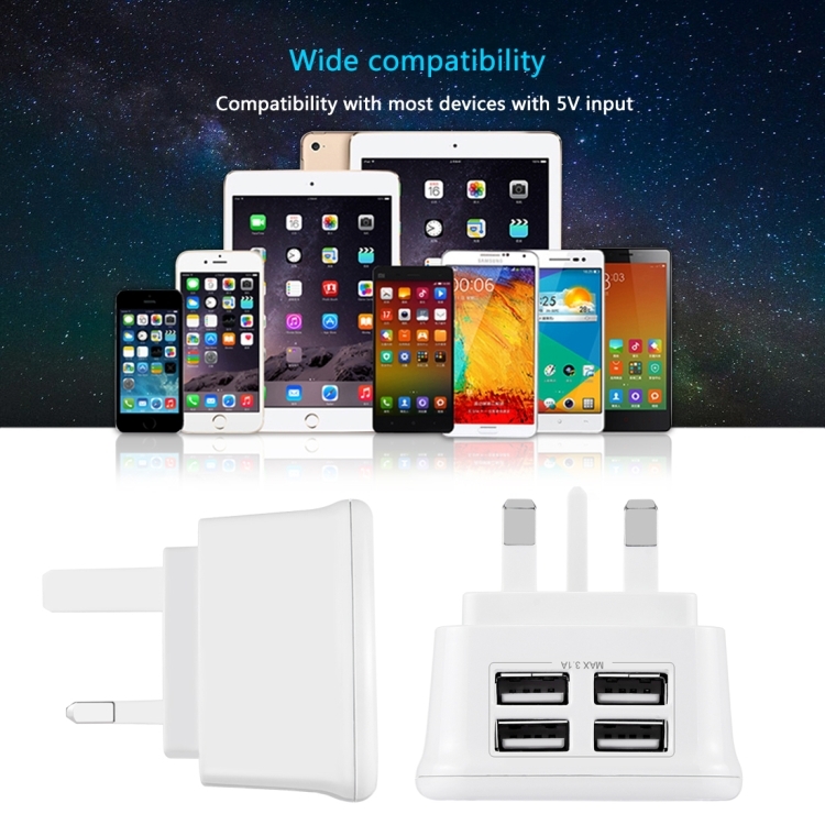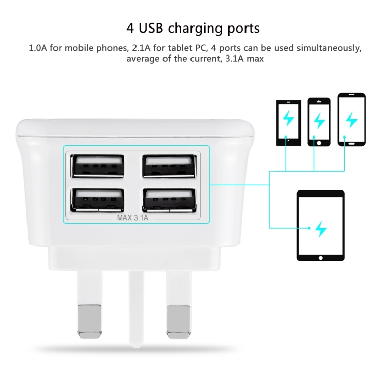 1.0A for mobile phones, 2.1A for tablet PC, 4 ports can be used simultaneously, average of the current, 3.1A max