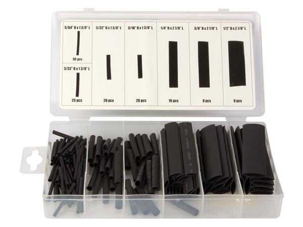 For anyone performing electrical work, this heat shrink tubing set is a must-have. The set includes a wide range of sizes for automotive, boat, motorcycle, ATV and household electrical applications. The heat shrink tubing set is constructed of 100 percent durable polyolefin rubber that shrinks up to half its original diameter for a snug fit. This handy heat shrink set is perfect for professional electricians and homeowners alike.